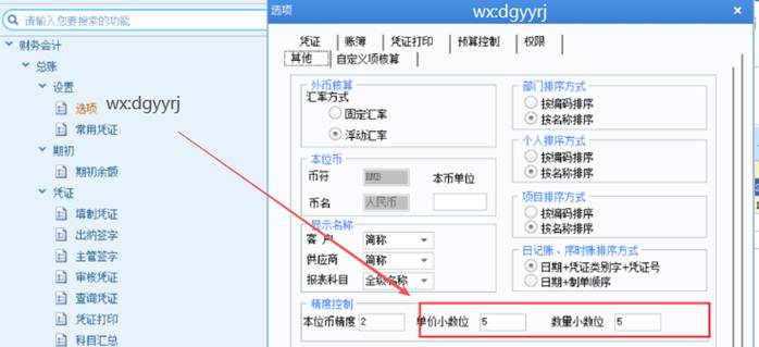 2、鼠標(biāo)打開財(cái)務(wù)會(huì)計(jì)-總賬-設(shè)置-選項(xiàng)-其他頁簽,然后錄入單位小數(shù)位和數(shù)量小數(shù)位,如圖下: